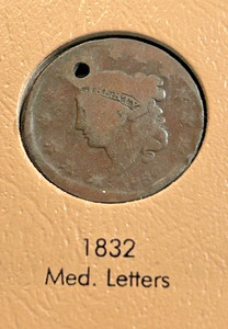 1832 Coronet Head Large Cent, Medium Letters, Rim Damage , Well Used, Holed