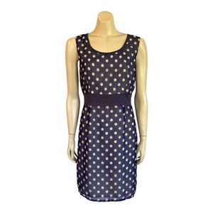 Fever London Shift Dress Sz 16 Satin Lined Chiffon Round Neck Blue Gold PolkaDot