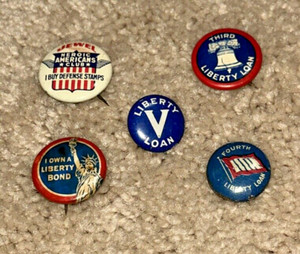 5 WWI LIBERTY LOAN / DEFENSE STAMPS / LIBERTY BONDS Buttons / Pins