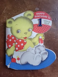 Happy Birthday 1 Year-Teddy Bear Rattle Vintage 1950's 3D Stanley Card