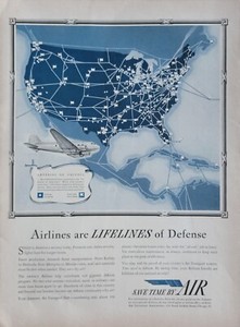 Air Transport Association, Route Map "Save Time By Air" 1940's Aviation Ad