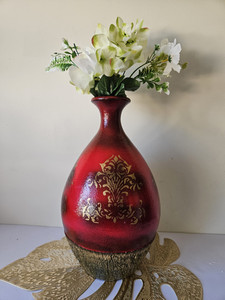 OOAK Vintage Art Deco Red Laquered Oxblood Floor Vase Gold Fleur-de-Lis 14"