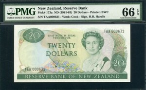 New Zealand 1981-1983 20 Dollars P173a Low S/N 631 PMG 66 EPQ GEM UNC