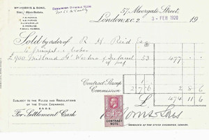 CONTRACT NOTE 1/- STAMP on M &Gt W RLY. £500 STOCK CERTIFICATE,.. 2nd FEB 1920.