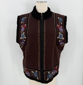Icelandic Womens Brown 100% Wool Embroidered Vest Size XL Faux Fur Boho Artsy
