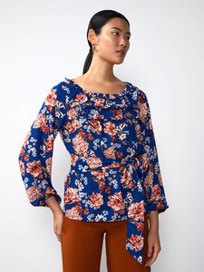 NWT New York & Company Blue Floral Ruffled Belted Top Sz M