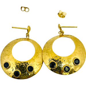 Blue Sapphire 14k Yellow Gold Hammered Drop Post Circle Earrings 31mm X 29mm