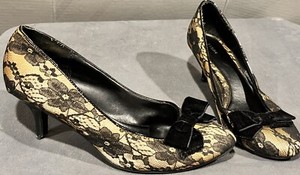 Fioni Black Floral Lace Gold Black Bow Pumps Womans High Heels Shoes 8.5