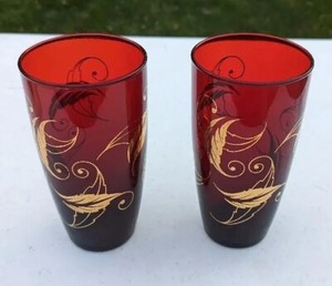 Drinking Glassses Ruby Red With Gold Color Leaf Design Set Of 2 VINTAGE! may23