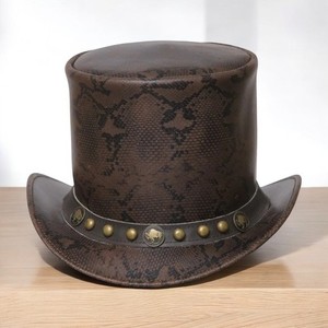 Brown Snakeskin Pattern Leather Steampunk Top Hat with Studded Band Cosplay