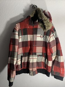 Ocean Pacific OP Women Large Hoodie Faux Fur Full Zip Quilted Lined Distressed