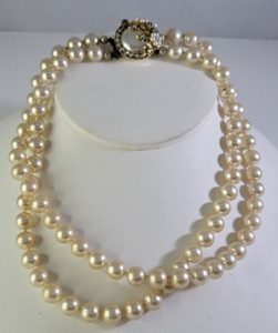 Vintage Signed JAPAN Pearl Knot 2 Strand Necklace Rhinestone Clasp RETRO 8.5mm