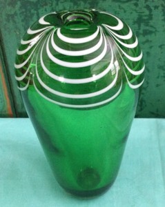 Vtg Pulled Feather Green Art Glass Hand Blown Vase 5”