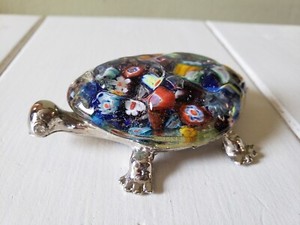 Millefiori Art Glass Metal Frame TURTLE Figurine Paperweight 3 1/2" Long Lovely
