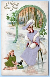 Postcard New Year Child Angel Shining Shoes Felt Dress, Horse Shoe Ice Skating