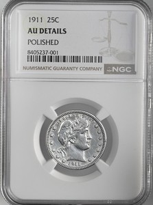 1911-P 25C BARBER SILVER QUARTER NGC AU DETAILS "POLISHED" #8405237-001