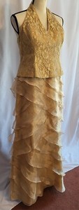 Vintage Gold Halter Maxi Formal Dress Lace Bodice Chiffon Tiered 8/10 ~READ~