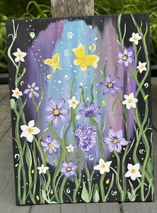 Original Art Work Painting Canvas Botanical Butterflies w/ Flowers Moonlight