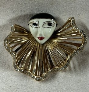 VTG CINER Signed Gold Tone Enamel Rhinestone Pierrot Large Brooch RARE FIND