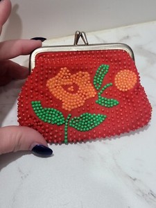 Vintage Beaded Kiss Snap Coin Change Purse Hong Kong Red With Orange Flowers