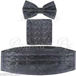 Brand New Paisley Charcoal Cummerbund And Bow tie & Pocket Square Hanky Set