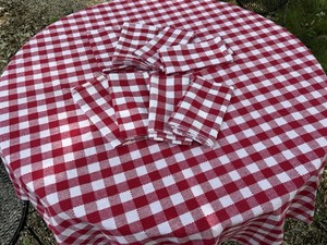 VTG 54" ROUND Tablecloth Red & White Checked 8 Napkins Picnic Farmhouse Cotton