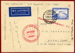 Germany 1929, 2m Solo on Postcard, Graf Zeppelin Flight, to Kobe, via Tokyo