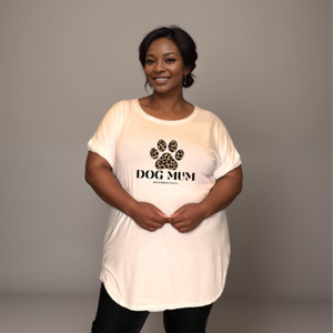 ROCKTHOSECURVES WOMENS DOG MUM LOGO DIPPED HEM T-SHIRT