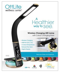 OttLite Wellness LED Desk Lamp Night Light Clock Thermometer & Wireless Charging