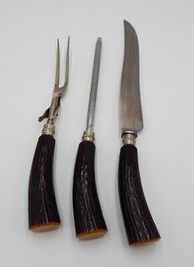 Latham & Owen Faux Elk Horn Carving Knife W/ Fork And Sharpener 3 Piece Set