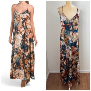 Nicole Miller New York Satin Floral Print Maxi Dress Size M Brown Blue Multi