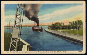 Postcard Freighter Downward bound Sault Ste Marie Michigan