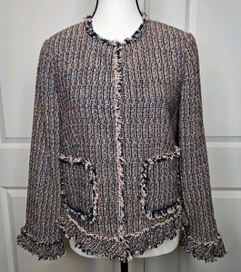 Rebecca Taylor Womens Tweed Blazer Size 6 Fringe Trim Pink & Navy Blue