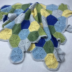 Handmade Crochet Baby Blanket Octogan Unisex Green Yellow Blue Grey EUC