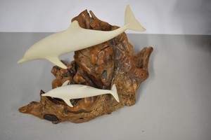 Vintage John Perry Two Dolphins on Burl Wood Base Sculpture Mother and Baby 11x6