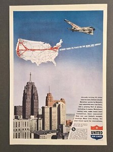 1946 VINTAGE PRINT AD - UNITED AIR LINES AD - DETROIT IS ON THE MAIN LINE AIRWAY