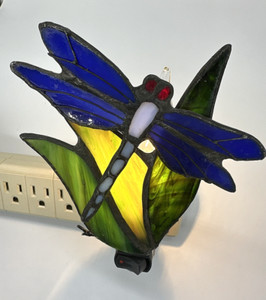 J J Peng Dragonfly Stained Leaded Glass Night Light 5" Blue Yellow