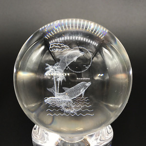 Glass Laser Etched Dolphins Ocean Sphere Orb Paperweight Ball 3D Palm Tree 3"