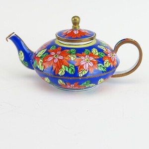 KELVIN CHEN Miniature Teapot Enameled Copper Poinsettias & Gift Bow 2000 No. 198