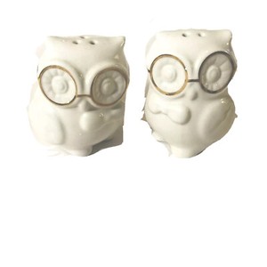 Set of 2 White Porcelain Owls Salt Pepper Shakers Trimmed Gold Glasses