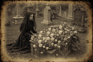 Victorian Funeral Photo Flowers Lady Mourning at Grave Cemetery Sepia Tone Print