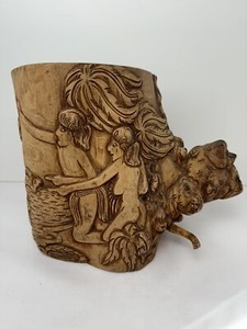 Vintage Olive Wood Carving Art Sculpture Adam & Eve In Paradise