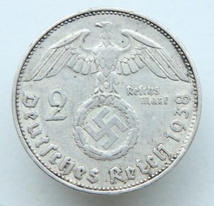 1938 GERMANY 2 MARK E DEUTSCHES REICH SILVER COIN EXCELLENT CONDITION HINDENBURG