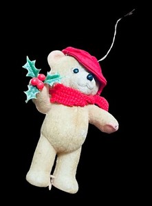 Vintage 80s BLOW MOLD Christmas bear flocked/Holly/scarf/cap Ornament 4”