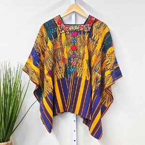 Vibrant Handwoven Mexican Poncho with Floral Embroidery