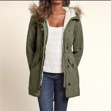 Hollister Teddy Sherpa Lined Parka Utility Jacket W/Faux Fur Hood Size S / Olive