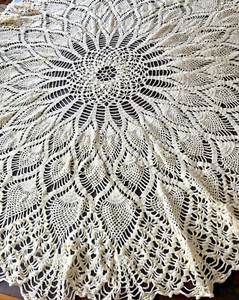 Hand Crochet Beige 57" Round Doily Lace Scalloped Edge Tablecloth Vintage