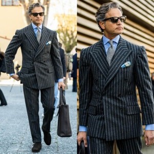 Herren Blauer Gestreifter Anzug Blazer Doppelreihige Jacke Spitzkragen Sakko