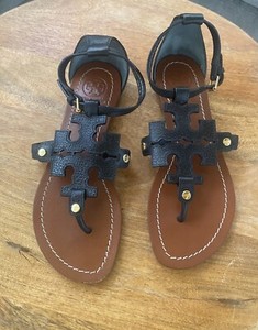 Tory Burch Phoebe Flat Thong Sandals Black Leather Miller Logo Size 5